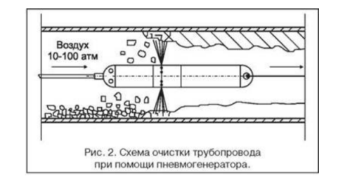 которая создаётся при помощи специальных пневмоимпульсных генераторов различной конструкции. Пневмогенератор в течение нескольких секунд заполняется сжатым воздухом, а затем за сотые доли секунды выбрасывает этот воздух в виде мощных импульсных струй. При этом обеспечивается огромный секундный расход воздуха и мощное разрушающее импульсное воздействие. Пневмоимпульсные технологии успешно используются на предприятиях энергетической, угольной и металлургической промышленности для очистки.Импульсные технологии являются более эффективными и экономичными по сравнению с другими, предназначенными для решения аналогичных задач. Основная экономическая целесообразность применения пневмоимпульсных технологий в задачах очистки состоит в устранении трудоемких дорогостоящих и зачастую опасных ручных операций, после чего становится возможным переход к реальной профилактике, что дает, в конце концов, существенное повышение эффективности использования постоянно действующего оборудования. Один из вариантов технологии, разработанный для очистки трубопроводов диаметром 50-300 мм, основан на использовании пневмогенератора диаметром 40 мм и длиной 350 мм. Питание генератора производится через гибкий шланг с внутренним диаметром 4-6 мм от баллона сжатого воздуха с давлением до 150 атм. Пневмогенератор срабатывает автоматически через 1-2 секунды и протягивается внутри трубопровода с помощью тросика диаметром 3-4 мм (см. рис. 2).