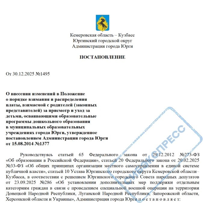 Администрация Юрги Кемеровской области отменила 100-процентную компенсацию оплаты детских садов для семей действующих участников боевых действий в Украине. Документ был подписан перед Новым годом, а сейчас родители столкнулись с тем, что от них требуют деньги. Из бюджета теперь будет компенсировать только 25% расходов. Тем, у кого один из родителей погиб из-за боевых действий, оставят стопроцентную компенсацию. При этом Юрга — это один из самых известных центров вооружённых сил России в Сибири. Здесь дислоцируется 74-я отдельная гвардейская мотострелковая бригада ВС РФ. В городе проживают около 80 тыс. человек. Подписаться| Прислать новость| Помочь бустами
