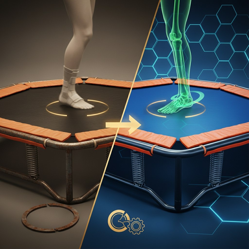 ? Переход на новую форму в профессиональном джампинге — это не дань моде, а вопрос физики и анатомии. 1. Безопасность ваших суставов. Главная проблема классического круглого полотна в том, что оно часто провоцирует супинацию — неестественное заваливание стопы наружу. Из-за неравномерного натяжения пружин в круге нагрузка на голеностоп и колени распределяется неправильно. Шестиугольная форма решает эту задачу, обеспечивая ровный отскок и безопасное положение ног.