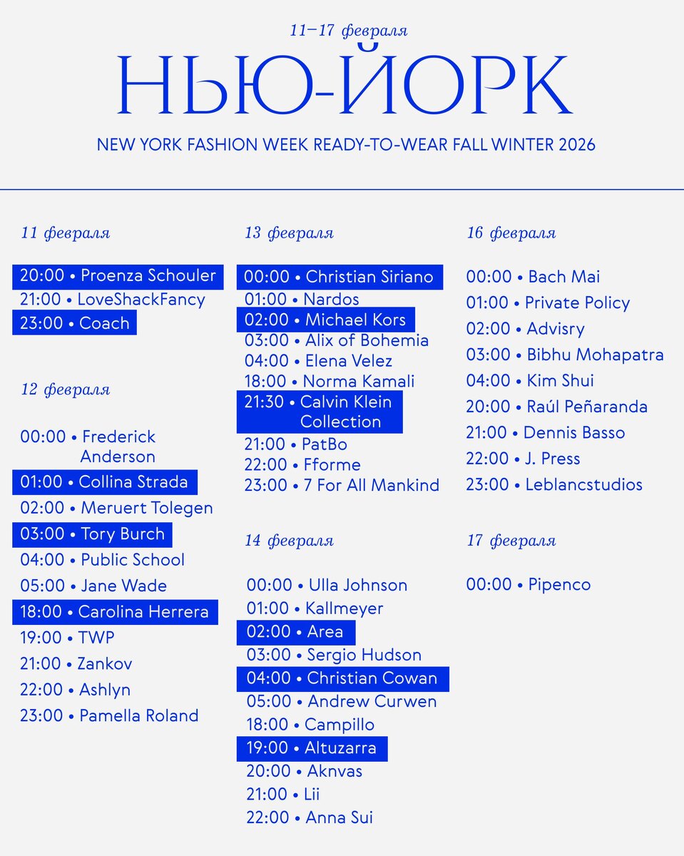 Самые ожидаемые показы выделили на карточке — и, конечно, взяли на особенно острый карандаш. 📌 Полное расписание показов предстоящего фэшн-марафона — ищите в модном календаре The Blueprint, а сами коллекции — в разделе «Показы». 🔹The Blueprint