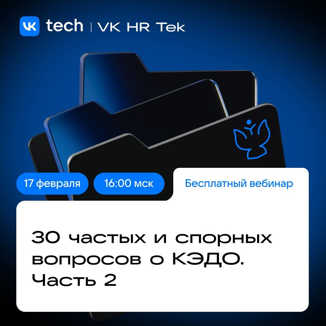 штрафы, а также какие документы обязательно хранить на бумаге. Однако не всё уместилось в один вебинар, поэтому мы подготовили еще один! 17 февраля в 16:00 (МСК) продолжим разговор на следующие темы: 🔵Охрана труда в цифре 🔵Особенности оформления кадровых документов 🔵График отпусков и уведомление о начале отпуска 🔵Некоторые аспекты взаимодействия с дистанционными работниками Спикер: Максим Семенов, директор по работе с госсектором, VK Tech 🔹 Когда: 17 февраля в 16:00 🔹 Где: Онлайн Вебинар будет интересен HRD, HR-специалистам и работникам отдела кадров Для участия нужно зарегистрироваться