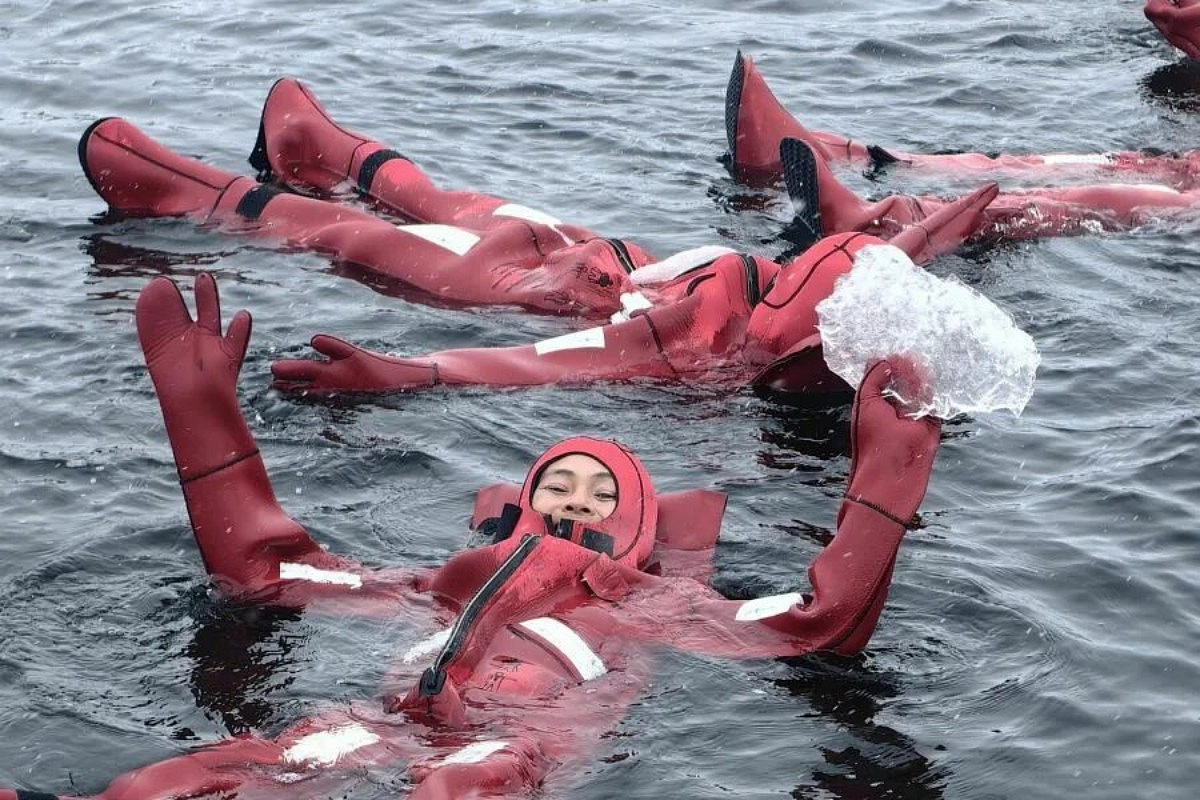 Для этого используются специальные герметичные гидрокостюмы из утолщённого неопрена толщиной 6 миллиметров, которые применяются в реальных спасательных операциях на море.