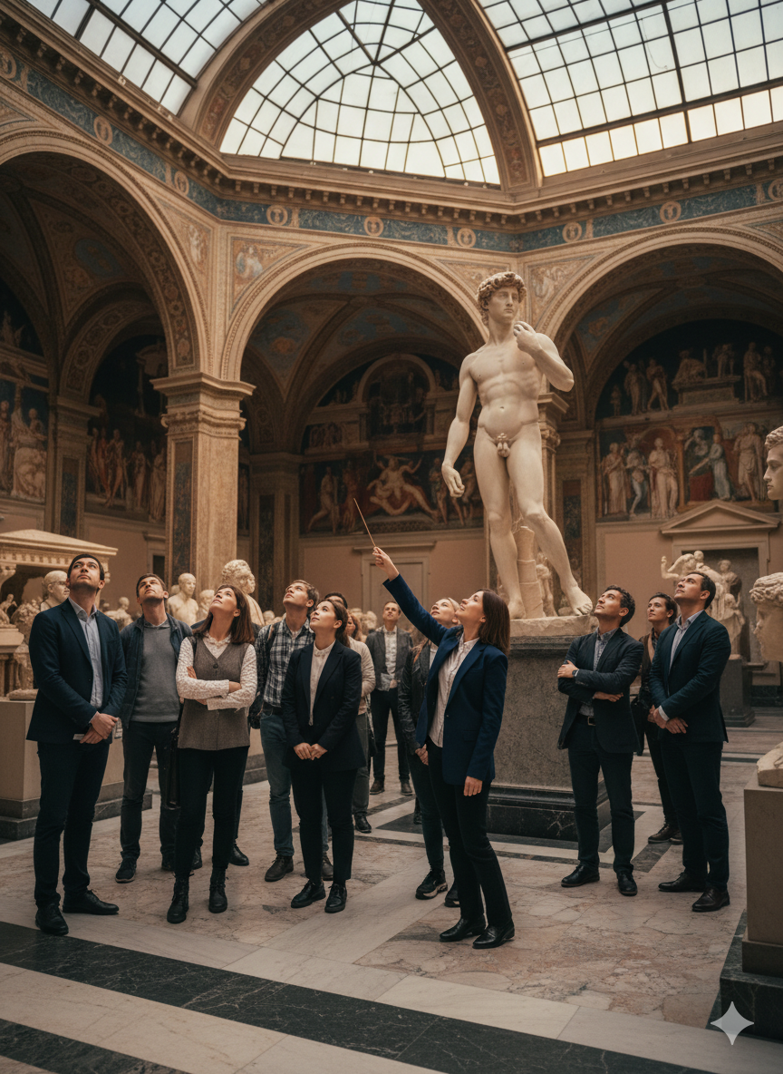 Итальянский дворик — визитная карточка Пушкинского музея и первое, что видят большинство посетителей. Именно здесь стоит знаменитая пятиметровая копия «Давида» Микеланджело — один из самых узнаваемых символов всего музейного комплекса.