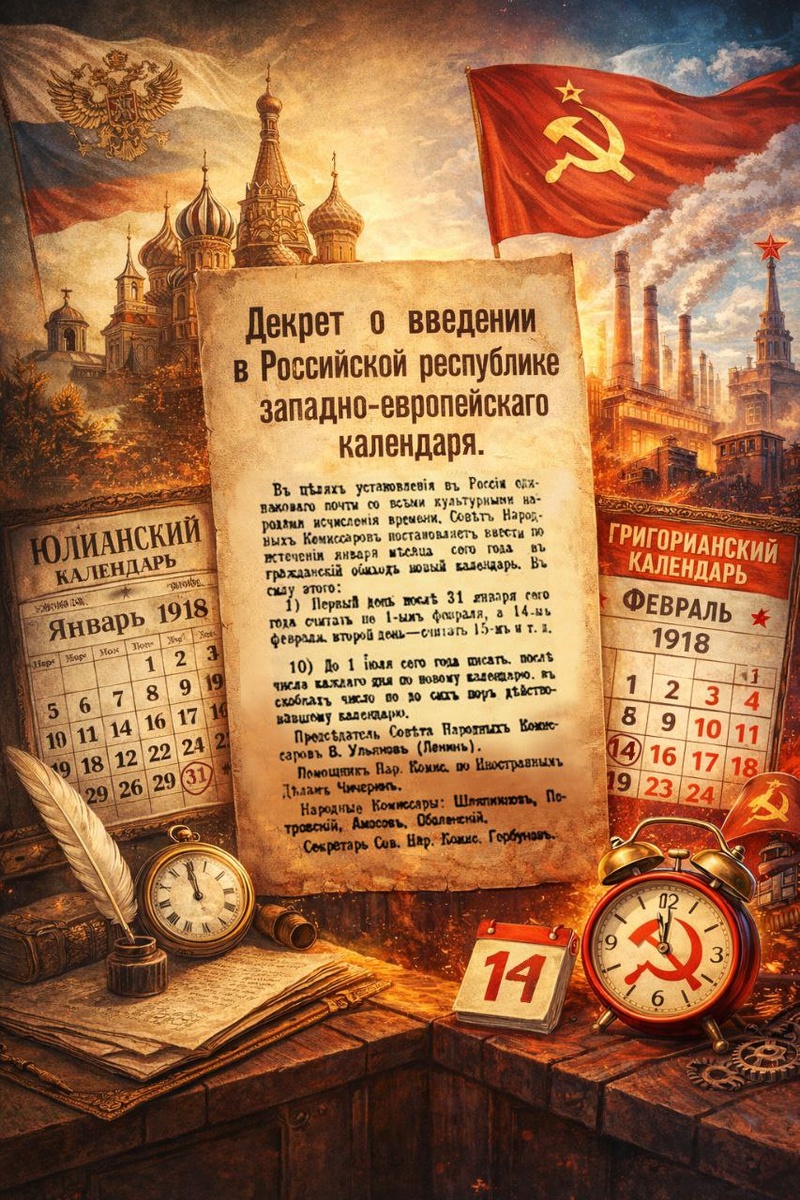 Когда время пошло по-другому 24 января (6 февраля) 1918 года Совет народных комиссаров «в целях установления в России одинакового почти со всеми культурными народами исчисления времени» принял декрет «О введении в Российской республике западноевропейского календаря». ⭐️27 января (9 февраля) 1918 года документ был опубликован и вступил в силу. Декрет предусматривал, что после 31 января 1918 года сразу наступит 14 февраля — точно так же, как и везде в Западной Европе: к моменту принятия документа разница между юлианским и григорианским календарями составляла 13 дней. 💣Такое сокращение февраля привело к тому, что, согласно тексту документа, почти на треть сокращалась и зарплата за февраль, а тем, кто получал ее дважды в месяц, 15 февраля не полагалось выдавать ничего. До 1 июля 1918 года декрет предписывал после числа по новому (григорианскому) стилю в скобках указывать число по старому (юлианскому) стилю. Впоследствии эта практика сохранилась, но в скобки стали помещать дату по