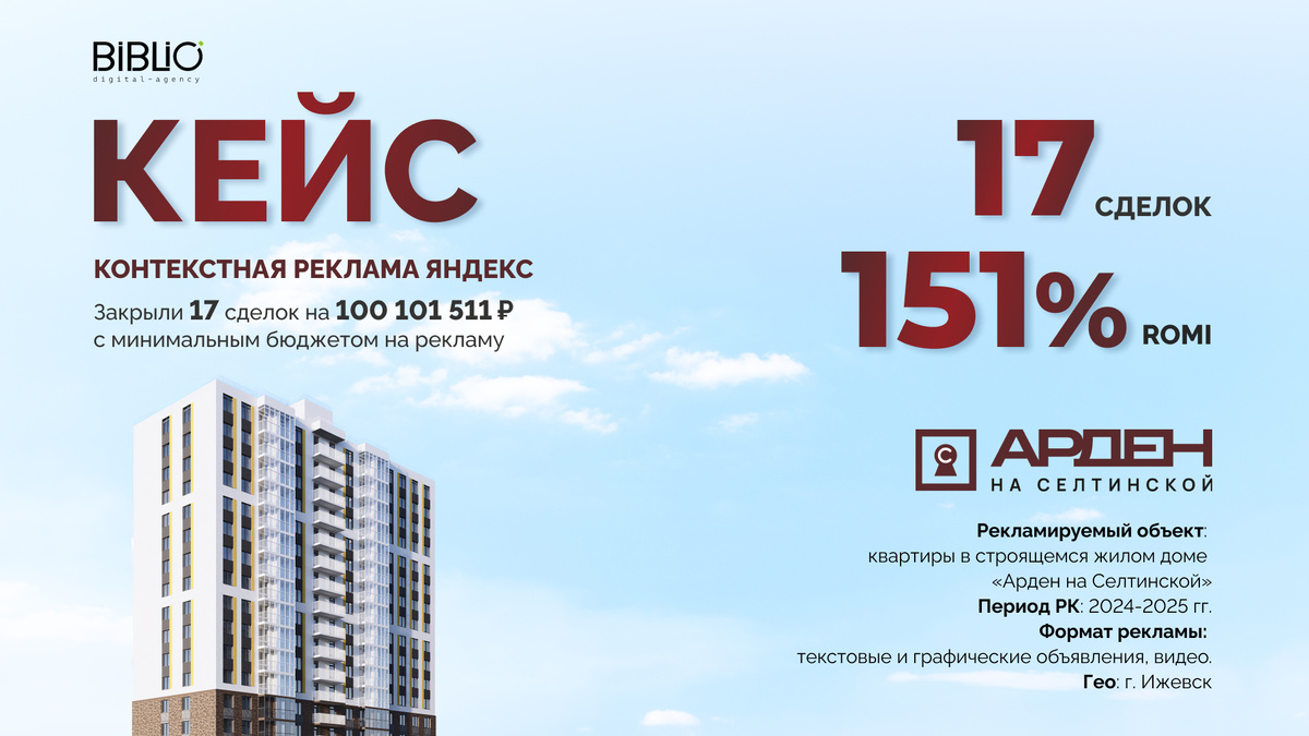 Рекламируемый объект: квартиры в строящемся жилом доме «Арден на Селтинской» Гео: г. Ижевск Период: 2024-2025 гг. Формат рекламы: текстовые и графические объявления, видео. Застройщик: группа компаний «Арден». Более 20 лет строительства, дает 5 лет гарантии на построенные дома. Цели: повышение эффективности отдачи от рекламы Сложности: Инструменты: целевые ключевые фразы, интересы и привычки, сегменты аудиторий. Формат работы: Помимо базовых и оптимизаций, которые проводятся еще на запуске: Мы работали и с другими составляющими: Вид рекламных объявлений: Итоговые результаты: Реклама окупилась на 151% за весь период размещения Из офферов лучше всего показывали конверсию: Результат по ипотеке логичен - семейная ипотека имела повышенный интерес, т.к. за эти годы сильно возросли ставки по обычной. Результат по каналам: Поиск - лид дороже, но сделка дешевле. РСЯ - лид дешевле, но сделка дороже Для поиска закономерен более дорогой лид в нише недвижимости, но как, показывает практика, нередко