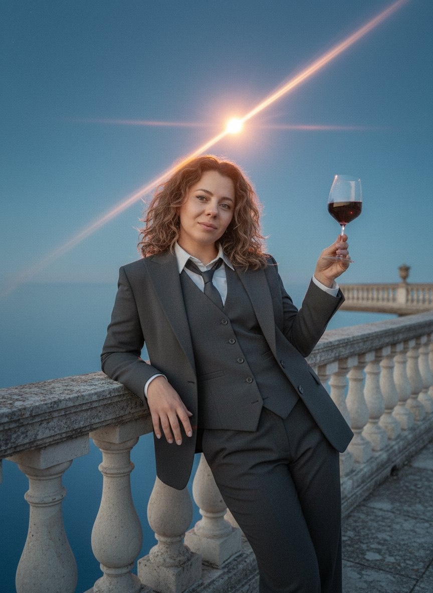 🎨 Промпт: A portrait of the woman from the reference photo, preserving her exact facial features and likeness, dressed in a sharp, tailored charcoal three-piece suit with a loosened tie. She is caught in a playful, surreal moment, leaning casually against a floating stone balustrade on a sun-drenched Mediterranean terrace, detached from the ground. The scene is set during blue hour twilight, but a magical, dreamlike backlight generates a radiant lens flare, contrasting with the deepening blue sky. She balances a glass of red wine perfectly in her hand. Muted desaturated palette with hints of fading warmth, shot on 35mm film with natural grain, whimsical atmosphere, creative composition. Банк Промптов | Твои Идеи