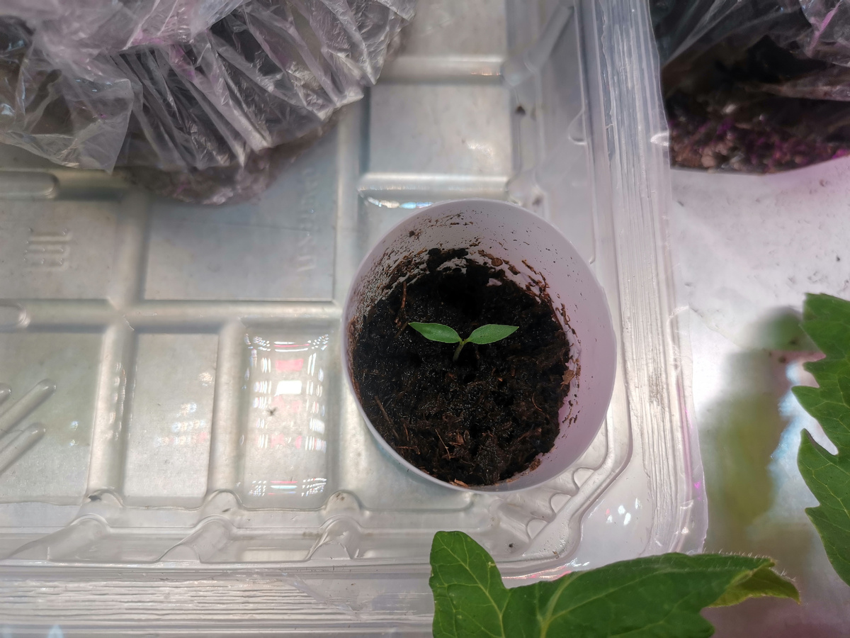 Меня очень заинтриговал этот перец, когда я его нашла, поэтому одно семечко было пророщено ещё в декабре, посажено. Он меня тут заоэдемил, потому что стоял в зимнем рассаднике, его приглушил перец Каролина Рипер, потому что я совсем про него забыла в декабре. В общем, бедный и несчастный выглядит сейчас так: