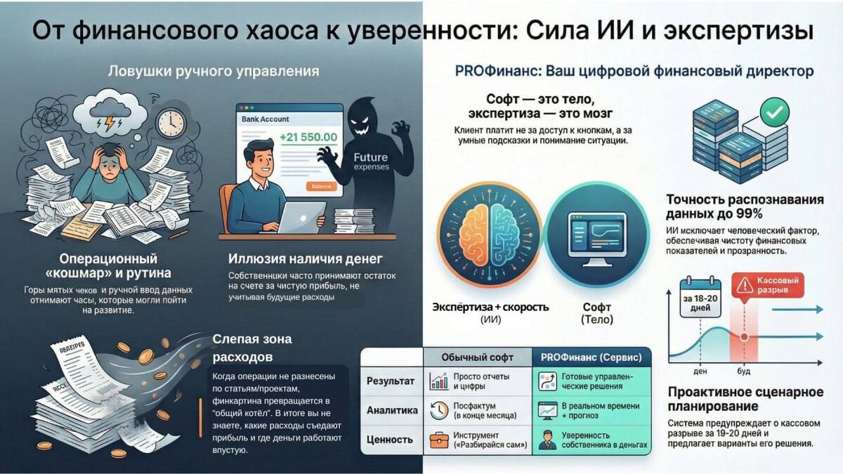 ? "Наталья, я не вспомню все расходы, у меня бардак с финансами. Чеки в разных местах, переводы с личной карты, наличка... Я даже не знаю, с чего начать". И вот тут я понимаю — дальше будет много слез и боли. Потому что без нормального сбора расходов я не смогу тебе помочь. Совсем. Это фундамент. Пока ты не соберешь все операции в один журнал — забудь про финансовый учет. А без учета что? Ты летишь вслепую. И то, что вам рассказывают финансисты, без нормального собранного журнала операций и отчета ДДС - это всё "пальцем в небо". Не будет у тебя понимания, куда уходят деньги. Не увидишь кассовый разрыв за месяц. Не спрогнозируешь, потянешь ли новый офис или еще одного сотрудника. О масштабировании вообще молчу. Вся эта боль начинается именно отсюда — с того, что собственник месяцами откладывает сбор данных. Думает: "Ну вот когда разгребусь, тогда и займусь", "Сейчас другие приоритеты", "Пока нет времени". А потом приходит ко мне и говорит: "Почему я не понимаю, сколько реально за
