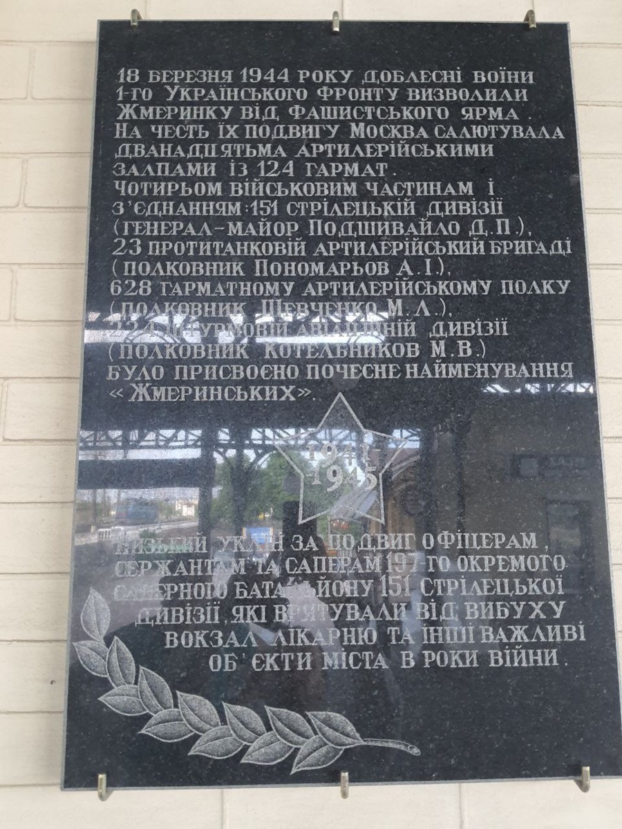 В Жмеринке на вокзале уничтожили мемориальную доску в честь освободителей Жмеринки от немецкой оккупации из 1-го Украинского фронта