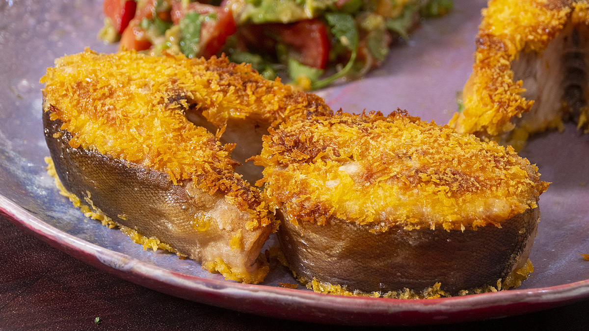 Терпуга очистить (чешуя, внутренности, плавники, голова), промыть, нарезать кусочками. Просушить на бумажном полотенце. Перепелиные яйца взбить с солью (льезон). Кусочки рыбы посолить → торцы обвалять в муке → окунуть в льезон → в панировочные сухари. Обжарить на сковороде с маслом по 1–2 мин с каждой стороны до золотистой корочки. Переложить на противень с фольгой → в духовку 180°C на 10–12 мин. Гуакамоле: мелко нарезать томаты, красный лук, чили + мякоть авокадо + сок лайма + щепотка зиры + рубленая кинза + соль → перемешать. На тарелку: хрустящая рыбка + щедрая порция гуакамоле. Получается сочная, хрустящая рыбка с ярким, свежим гарниром — ресторанный уровень дома! Приятного аппетита!