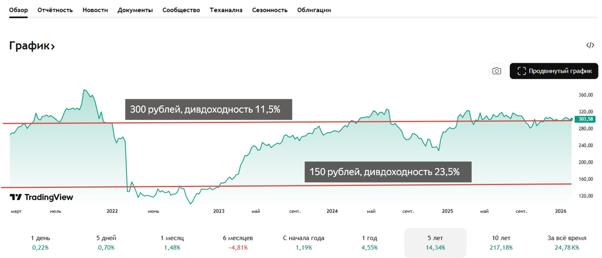 Сейчас акции Сбербанка тоже стоят около 300 рублей. Кто купил их в 2021 и ничего не делал, имеет примерно нулевой результат в портфеле (помимо этого, получает дивиденды с доходностью около 11,5% - это ниже ставок по вкладам). Но кто купил в районе 150 рублей на просадке - имеет результат 100% в портфеле и получает дивиденды с доходностью 23,5% - это выше ставок по вкладам.