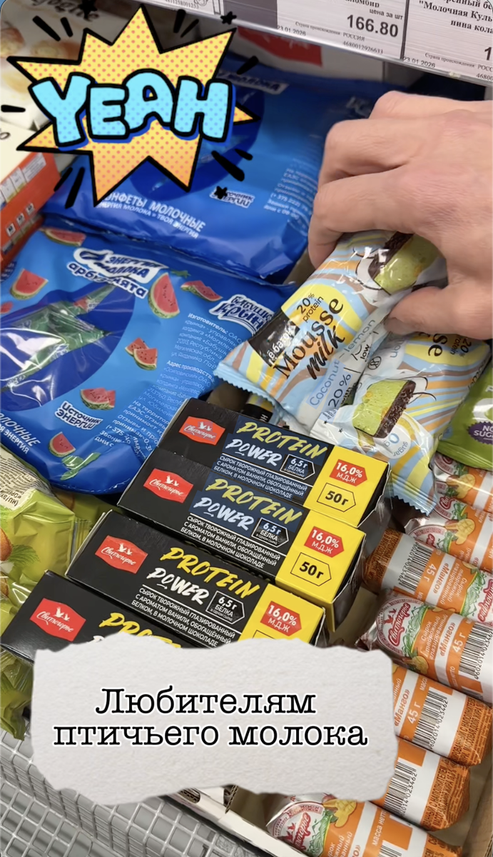 🕊️Почти птичье молоко (или даже лучше) Привет мои «Вечно худеющие» любители сладенького, а если более конкретно - любители птичьего молока и других видов суфле. Нашел ОЧЕНЬ ВКУСНЫЙ десерт от Ё Батон по мотивам «Птичьего молока» со вкусом кокоса и лимона. ℹ️Обращаю внимание десерт не самый низкокалорийный, калорийность сопоставима с классическим Птичьем молоком, однако баланс БЖУ отличается, вписать в ежедневный рацион Худеющего чуточку проще. 👍Белки - 20 г (на 100 г) 👎Жиры - 25 г 👌Углеводы - 17,5 г 🤘Вес всего 40 г, поэтому калорийность одной порции не очень высока - 160 кКал! 💝Это продукт не на каждый день! Но это очень вкусно. 📢 Данный материал является авторским контентом, созданным исключительно в ознакомительных целях. Материал не является рекламой, медицинской рекомендацией или призывом к действию. #ВХ_находки #пп #зож