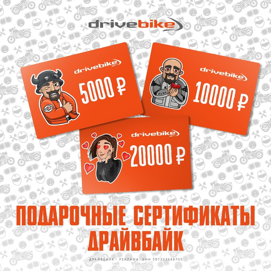 ? Сделайте подарок мотоциклисту, который точно попадет в цель! Электронные сертификаты "ДрайвБайк" доступны в нескольких номиналах, чтобы соответствовать любому бюджету и предпочтению: 1000 рублей 2500 рублей 5000 рублей 10000 рублей 20000 рублей Электронные подарочные сертификаты приобретаются онлайн в интернет-магазине ДрайвБайк. Совершить покупки по ним можно так же в интернет магазине ДрайвБайк. Подробные условия и информация - здесь.