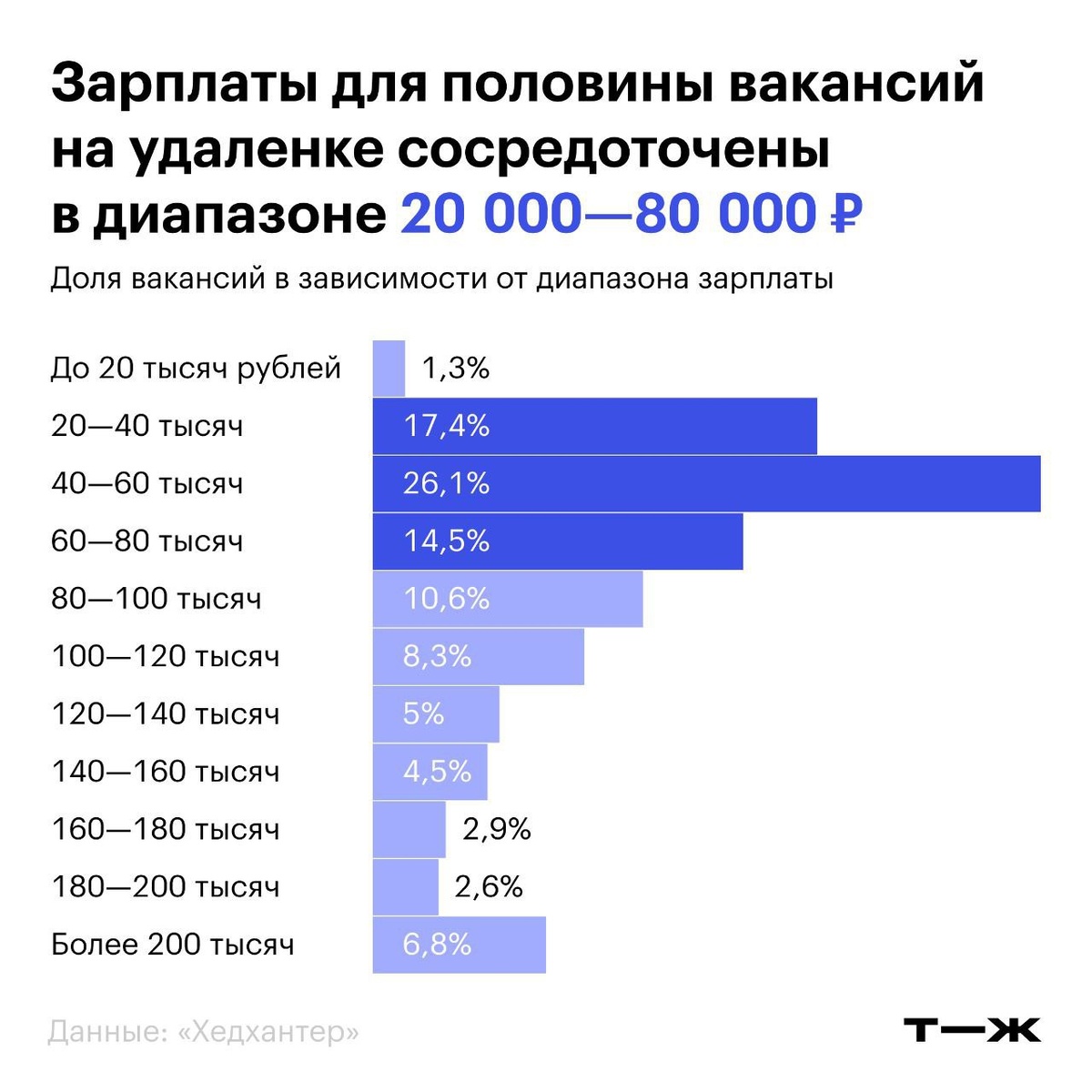 % россиян частично или полностью трудилось на удаленке в 2025 году. 🔵45 000 ₽ в среднем предлагают соискателям без опыта работы — он не требуется примерно в каждой третьей вакансии. 🔵23,7% вакансий с удаленкой размещены в Москве. Чаще всего в столице ищут дизайнеров — 57,6% от всех вакансий в этой сфере. 🔵174 000 ₽ медианная зарплата программистов — это самая высокооплачиваемая удаленная работа. Посчитали все вакансии с удаленкой: https://t-j.ru/tg/remote-work-stat/