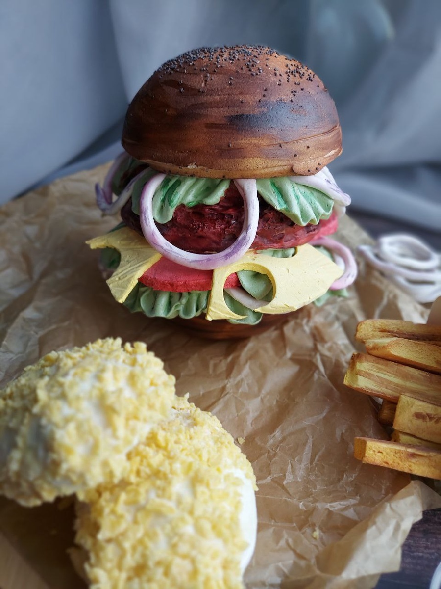 Зефирный бургер размер XXL, карточка фри, куриные ножки