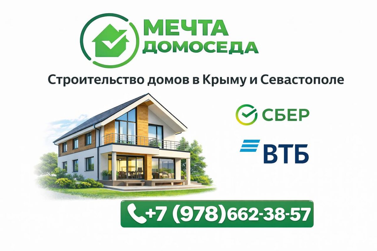 Планируете построить собственный дом в Крыму или Севастополе, но переживаете за банки, документы и риски? Вы по адресу. Мы — строительная компания «Мечта Домоседа», ✔️ аккредитованный застройщик банков ВТБ и Сбер ✔️ строим частные дома от комплектации теплый контур до под ключ с ремонтом ✔️ работаем в ипотеку, включая семейную ипотеку Почему это важно? Аккредитация застройщика означает: ✅ банк проверил компанию ✅ строительство соответствует требованиям ипотеки ✅ деньги защищены (эскроу счета ) ✅ сделка проходит быстрее и спокойнее Что мы делаем: 🔹 проектируем дома под ваш участок 🔹 строим современные дома из сертифицированных материалов (гарантия от 5 лет) 🔹 сопровождаем ипотеку от заявки до ввода дома в эксплуатацию 🔹 работаем строго по договору Мы строим: 🏠 дома для ПМЖ 🏠 дома для отдыха 🏠 дома в ипотеку в Крыму и Севастополе Если вы ищете надежного застройщика в Крыму, хотите построить дом в ипотеку через Сбер или ВТБ — мы поможем пройти весь путь без лишних рисков и нервов.