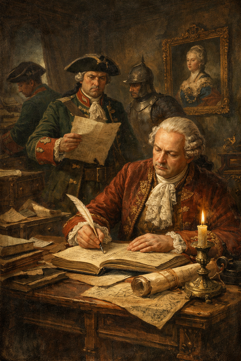 В особняке стояла траурная тишина: ночью скончался Михаил Васильевич Ломоносов — один из самых известных людей своего времени. Его тело ещё находилось в доме, а по комнатам уже ходили гвардейцы без опаски открывая шкафы, разбирая бумаги и складывая рукописи в аккуратные стопки.