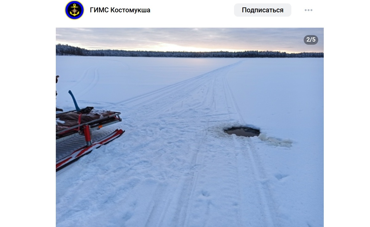 На озере на севере Карелии рядом с лыжней обнаружили тонкий лед. Рыбаки, лыжники и любители погонять на снегоходах могли провалиться. Сотрудники ГИМС обнаружили опасное место на озере Кимасозеро, где недавно прошел поход по «Лыжне Антикайнена». Прямо у лыжни в нескольких метрах от тростникового мыса, напротив острова Ахвеншуари, было обнаружено место с толщиной льда всего 5 сантиметров. Лед в этом месте легко пробили обычной лыжной палкой. Топором вскрыли майну глубиной около 1,5 метров. «Внешне место практически не отличается от окружающего ледового покрова, но при установлении теплой погоды наверняка будет представлять опасность и для рыбаков, и для снегохода», - подчеркнули в паблике ГИМС Костомукша. В опасную трещину установили длинный шест с флажком. В ГИМС призвали жителей Карелии не доверять красивому «снежному одеялу».