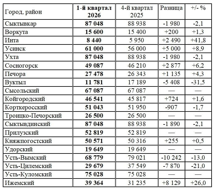 Министерство строительства и ЖКХ Республики Коми разместило на портале общественного обсуждения проектов нормативных актов проект приказа о средней рыночной стоимости одного квадратного метра жилья на первый квартал 2026 года (период с января). Согласно документу, изменения затронут 15 муниципалитетов: — в 8 стоимость вырастет; — в 7 — снизится. Максимальная цена — 87 048 рублей за кв. м. — будет установлена в Сыктывкаре, Ухте и Сыктывдинском районе. Минимальная — в Инте: 8 440 рублей за кв. м. Таким образом, по расчётам ведомства, жильё в Сыктывкаре почти в 5 раз дороже, чем в Воркуте, и примерно в 10 раз дороже, чем в Инте. Наиболее существенные изменения в денежном выражении ожидаются: — в Усть-Вымском районе (–10 242 рубля); — в Ижемском районе (+8 129 рублей); — в Усть-Цилемском районе (–7 870 рублей). 📱Подпишитесь на Юрган 📲Юрган в MAX