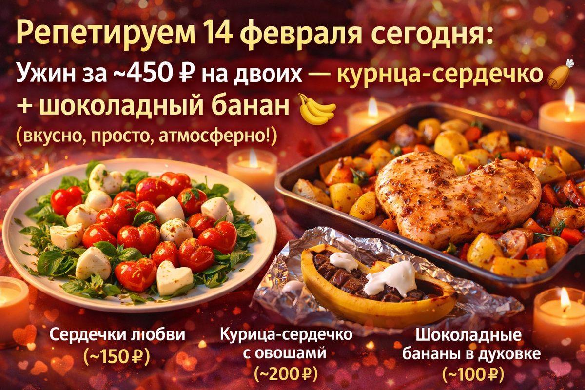 Вечер настал — самое время потренировать ужин к 14 февраля, чтобы в праздник не бегать по кухне в панике, а спокойно наслаждаться моментом. Всё из ближайшего магазина, ничего сложного, выглядит мило и празднично, а главное — вкусно и бюджетно. Общая стоимость ~450 ₽ на двоих (цены 2026 года, проверено по акциям). Меню на двоих: репетиция идеального вечера Как подать атмосферно: