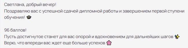 😆 Сегодня утром обнаружила, что мою дипломную работу приняли! 96 баллов из 100! Честно, я в шоке 🙈😆 Делала, учила, писала, но никак не ожидала такой высокий результат. Значит все эти бессонные ночи и учебные выходные были не зря) Осталось подождать пока выпустят сам диплом 🪪 Еще чуть чуть и я - нутрициолог! 😁 Горда собой 🥰