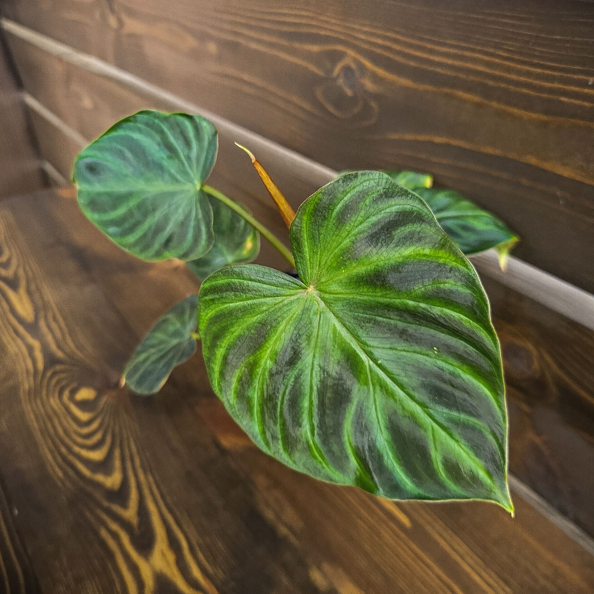 Забудьте о привычных глянцевых листьях. Филодендрон «Веррукозум» — это тактильное и визуальное наслаждение. Его крупные, сердцевидные листья покрыты нежнейшим бархатом глубокого изумрудно-оливкового цвета. Но главная магия — в контрасте: светящиеся салатово-серебристые прожилки расходятся от центра, создавая эффект внутреннего свечения. А обратная сторона листа и длинные черешки окрашены в страстный пурпурно-бордовый оттенок.