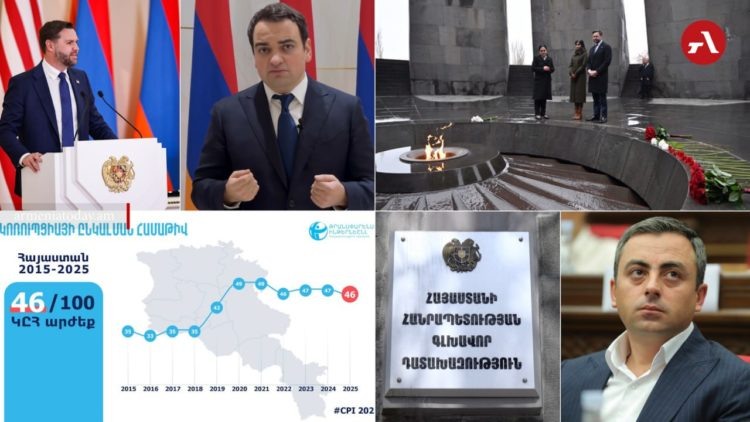 Вице-президент США Джей Ди Вэнс посетил мемориал Цицернакаберд, после чего удалил публикацию с упоминанием Геноцида армян, в Армении разгорелся спор вокруг перевода его заявления по атомному сотрудничеству, парламент отклонил резолюцию оппозиции о политзаключённых, Transparency International зафиксировала ухудшение показателей по коррупции, а Генпрокуратура потребовала конфисковать имущество у оппозиционного депутата Ишхана Сагателяна. Главные новости дня. Вэнс посетил Цицернакаберд и удалил пост с упоминанием Геноцида армян Вице-президент США Джей Ди Вэнс вместе с супругой возложил венок к мемориалу жертв Геноцида армян и оставил запись в Книге почётных гостей. Также он оставил пост в X об этом событии, где употребил термин «геноцид», однако позже удалил соответствующую публикацию из соцсетей. В рамках визита он также встретился с премьер-министром Николом Пашиняном, обсудив региональную безопасность, двусторонние отношения и сотрудничество в атомной сфере, после чего направится в Азе