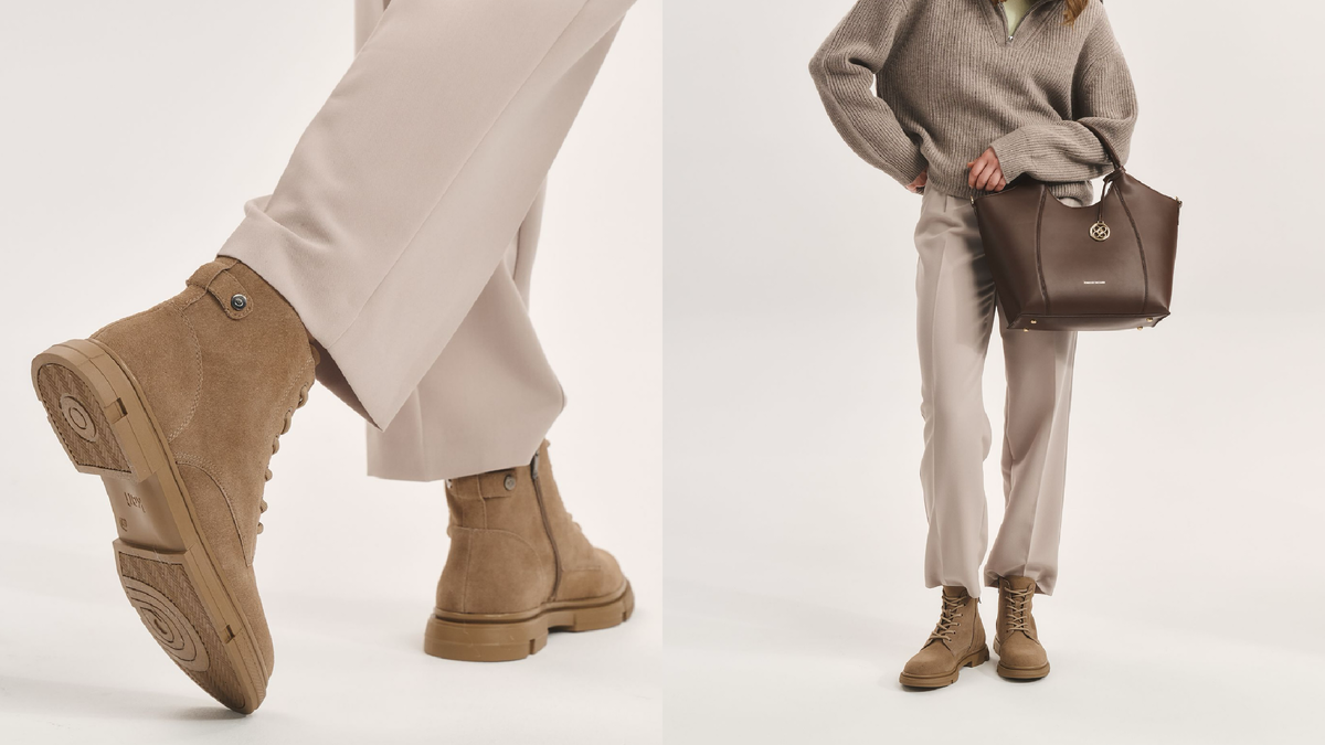 Натуральная замша — материал, который раскрывается в прикосновении. Плотная, гибкая, с выразительной фактурой, она придаёт обуви мягкий характер и ощущение уюта. Благородный коричневый оттенок подчёркивает глубину текстуры и делает ботинки универсальной базой на новый сезон. Такая пара ботинок (арт. W7100230) легко станет фаворитом: она одинаково гармонично смотрится и с денимом, и с трикотажем, и с лаконичными пальто. В качестве дополнения — сумка-тоут (арт. 064001K0) необычной формы с объёмной косметичкой внутри. Гладкая экокожа создаёт контраст по фактуре, а более насыщенный оттенок коричневого добавляет образу выразительности. Вместе они образуют сбалансированное сочетание, построенное на игре материалов и тонов.