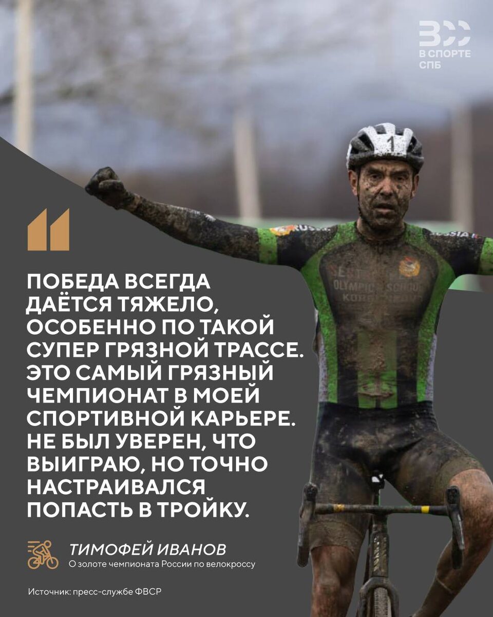 ! 🗣️ Тимофей Иванов прокомментировал свою победу на чемпионате России по велокроссу. Опытный петербургский спортсмен многое повидал за свою карьеру, но этот чемпионат ему точно запомнится. 🥇 Главная гонка в сезоне велокросса прошла в Архипо-Осиповке. Тимофей финишировал первым с результатом 55 минут и 9 секунд. Ближайший конкурент отстал от нашего атлета на 45 секунд. 🥇🥉 В рамках первенства страны среди юниоров 17-18 лет золото завоевал Иван Панчихин. На всероссийских соревнованиях Дарья Маисеенко стала второй в состязаниях девушек 13-14 лет. 🙌Будь ВСпорте!