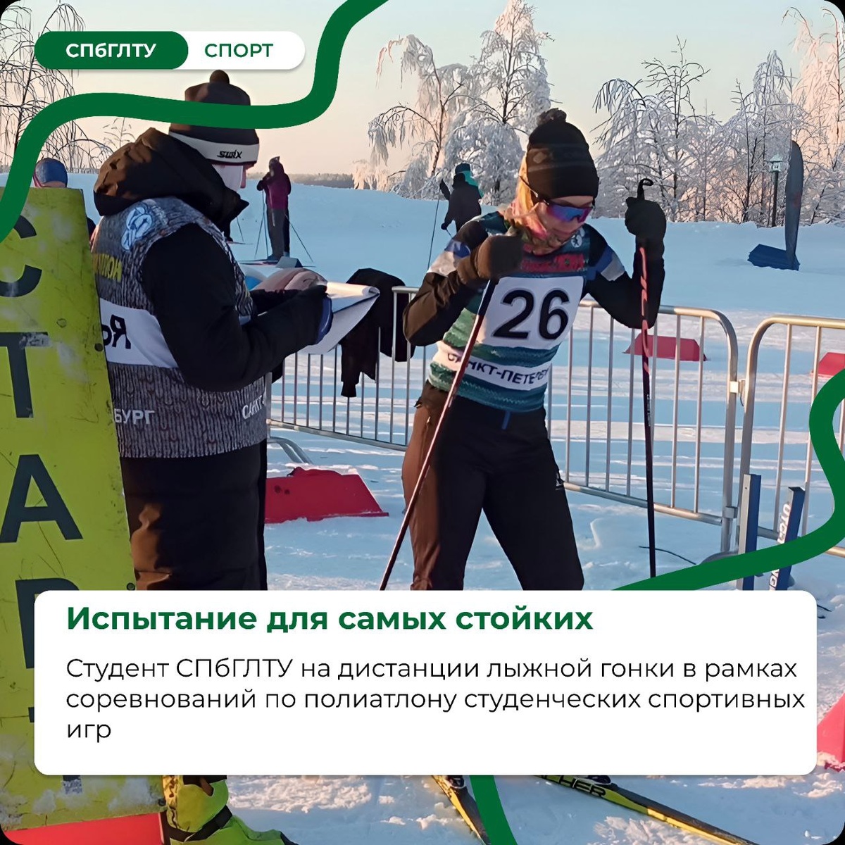! 1 февраля завершились трёхдневные соревнования по полиатлону в рамках Санкт-Петербургских студенческих спортивных игр. Нашу команду представляли настоящие универсалы: • Иванова Елизавета - Институт леса и природопользования • Иванов Максим - Институт леса и природопользования • Белов Никита - Институт химической переработки биомассы дерева и техносферной безопасности Им предстояло пройти три сложнейших испытания за один старт: стрельбу из пневматической винтовки, силовую дисциплину (подтягивания/отжимания) и лыжную гонку на 5 или 10 км! Мы гордимся нашими спортсменами и их стремлением побеждать на самых сложных стартах! 🐺💚 👉 Фото с соревнований смотрите на нашем сайте #СПбГЛТУ #СПбГЛТУ_спорт 👻 МАХ | 📲 ВК | 📝 ДЗЕН