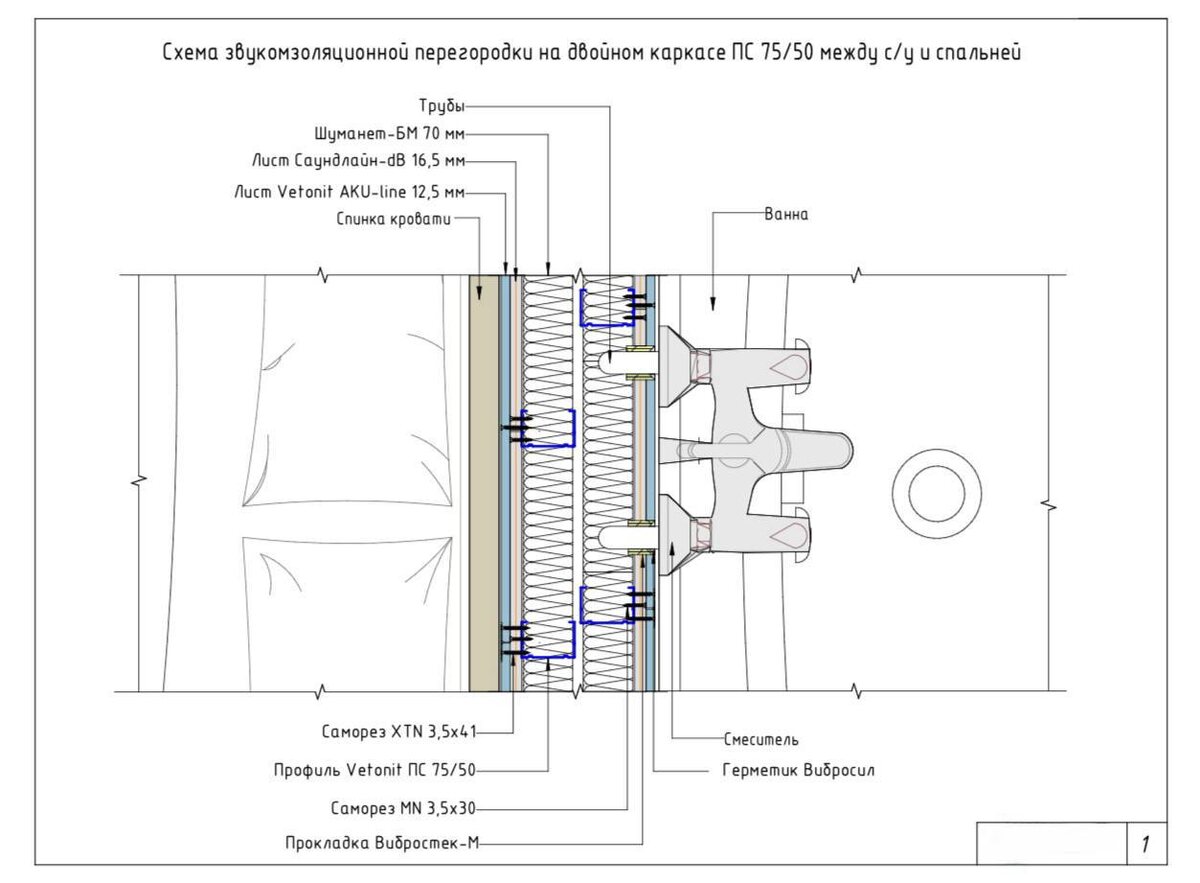 Совсем недавно поднимали спорную тему о шуме воды в ванной. А как в ванной своей квартиры сделать грамотную звукоизоляцию? Все-таки, ванная - шумное место Все очень просто - делаем звукоизоляционную межкомнатную перегородку на двойном каркасе. В чем суть? Представьте, что перегородка разделяет ванную комнату и спальню. Причем, конечно, по закону подлости, кровать встает изголовьем именно к этой перегородке: каждое включение воды будет не то что слышно, а «прямо в голову». И с этим справляется двойной каркас. Оба каркаса заполнены ватой Шуманет-БМ, обшиты листами Саундлайн-dB и Аку-лайн, но к одному крепится смеситель, унитаз или раковина. Фокус в том, что каркасы в такой перегородке развязаны и не передают друг другу ни шум, ни вибрацию. (См.схему) И самое интересное, что такая конструкция дает звукоизоляцию аж в 72 дБ! Проблема решена!