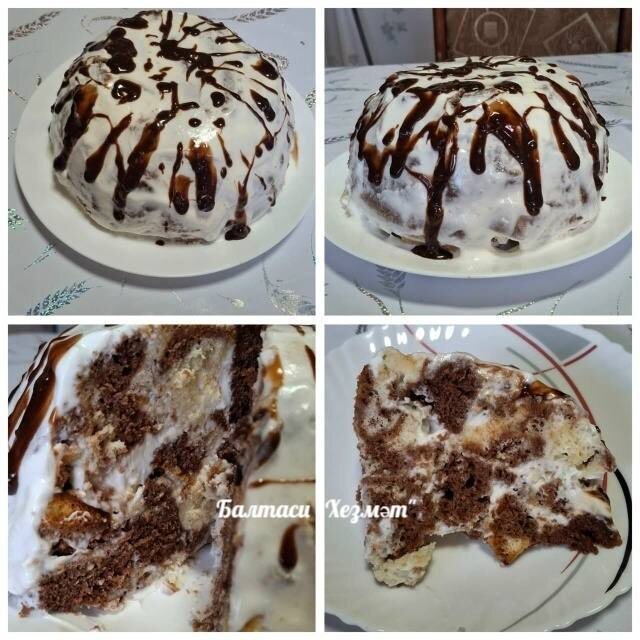 Камыр өчен кирәк була: Йомырка – 4 шт Шикәр комы -140 гр Сметана – 3 аш кашык Сгущенка – 0,5 банка Разрыхлитель – 1 пачка Он – 250 гр Крем: Сметан 20% – 500-600 гр, шикәр комы – 100 гр Бизәр өчен: молочный шоколадны эретеп или каты килеш кырсаң да була. Эш барышы: йомырка белән шикәр комын бергә көбекләнгәнче болгатасы,сметан һәм разрыхлитель, сгущенка салып тагын болгатасы, җайлап онны кушасы. Духовкада 180 градуста 20 минут тирәсе пешерәсе. Пешеп суынгач, шакмакларга кисеп, сметанга манып аласы һәм 2 литр тирәсе табакка пакет киертеп, пакетны бераз кремлап, шакмакларны тезә барасы. 2 сәгать холодильникта тора, алгач тәлинкә куеп төбенә каплап, пакетны аласы һәм калган крем белән бизисе.
