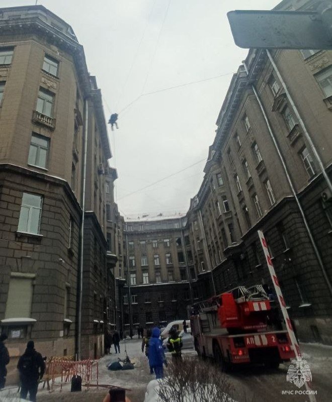 Рабочий без страховки сорвался с крыши дома на улице Правды и остался висеть на проводах. Прохожие в панике фотографировали происшествие и ждали прибытия спасателей. Мужчину благополучно спасли — он жив, но находится в состоянии шока 📷: МЧС Петербурга Читай нас в MAX! | Читай нас в Telegram