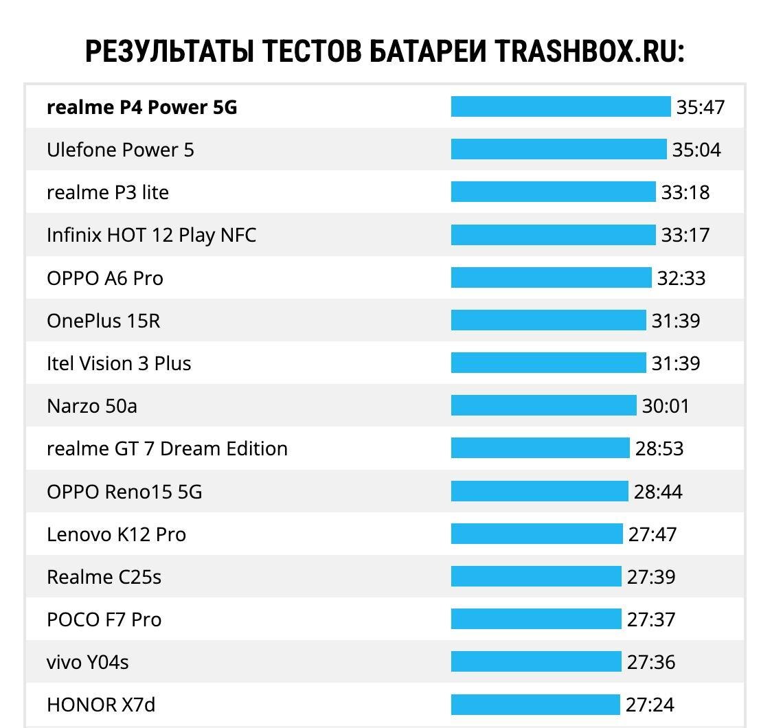 В тесте автономности Trashbox.ru новым рекордсменом стал realme P4 Power 5G с аккумулятором емкостью 10 001 мАч. Полный обзор устройства ожидается в ближайшее время. https://dzen.ru/id/5c0e38ff46ef5c00aaa80527