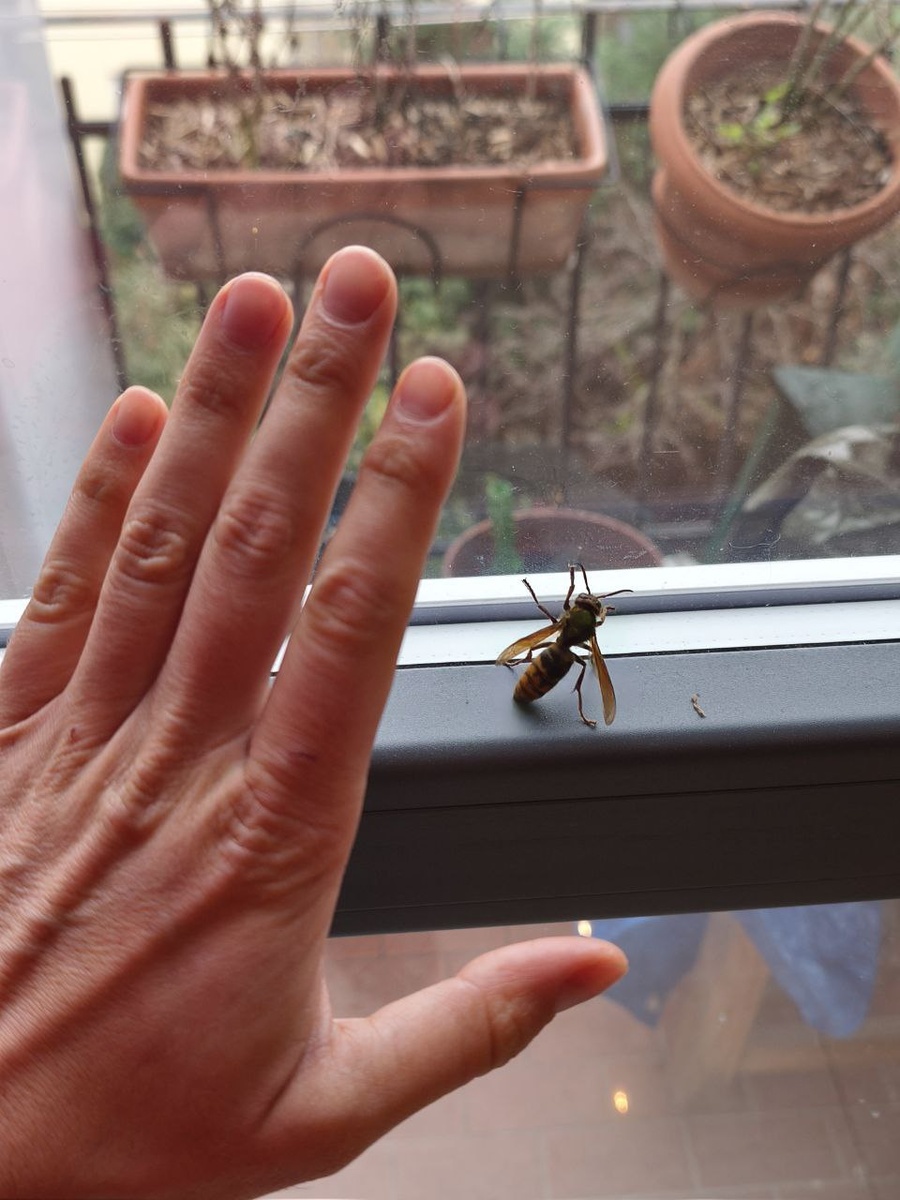 Насекомых я не боюсь, но сидеть 6-10 часов в скорой помощи, в ожидании врача все же не хочется. Поэтому взял пакет из под печенья, дождался, пока это чудо заберётся на него и выпустил. "Гигантская оса" улетела!