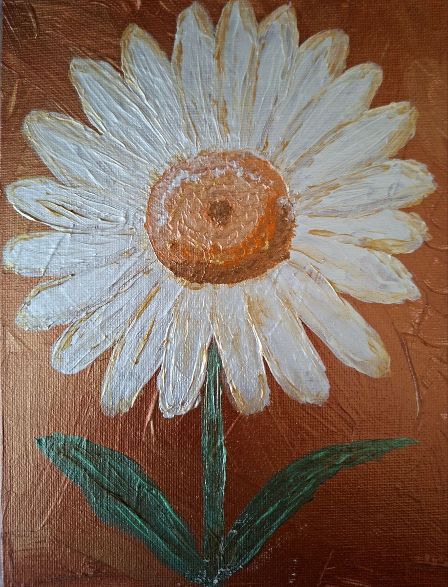 В этой работе пространство стало проще, но напряжение — сильнее. Фон почти однородный, тёплый, охристо-коричневый. Он не конкурирует с цветком, не ритмизирует поверхность, как трава во второй работе. Он молчит. И за счёт этого ромашка оказывается полностью на виду. Цветок смещён вверх, стебель вытянут, листья подчёркнуто условные. Это уже не попытка «встроить» форму в среду, а стремление выделить её. Почти как знак. Почти как символ — но без декоративности. Лепестки стали массивнее. В них больше белого, больше плотности. Золотистые линии читаются жёстче, мазок виден отчётливо. Поверхность не сглажена — фактура остаётся открытой. Здесь не про нежность. Здесь про присутствие. Сердцевина менее сияющая, чем в первой работе, и менее напряжённая, чем во второй. Она спокойнее, но тяжелее по тону. Цветок не «светится», он стоит.Стебель прямой, почти графичный. Листья намеренно упрощены — они поддерживают вертикаль и не отвлекают внимание. Если первая работа была про тишину, вторая — про среду