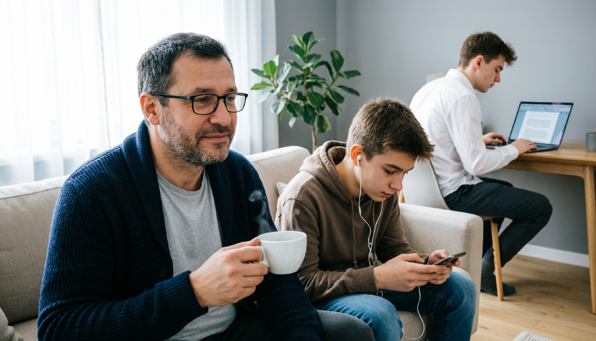 В субботу утром я застал странную картину. Старший, Ваня, приехал на выходные в гости, но сидит с ноутбуком на кухне, читает какую-то статью. Младший, Сережа, лежит на диване с телефоном. Оба молчат. Я прошел мимо, налил кофе, сел рядом. Тишина. Я кашлянул — ноль реакции. Пришлось щелкнуть пальцами перед носом у Сережи, чтобы он оторвался от экрана.
