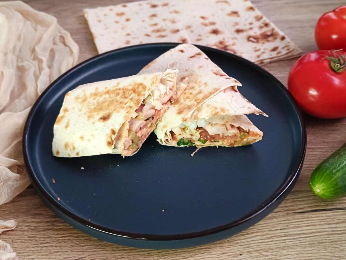 Вкусная и полезная альтернатива фастфуда Ингредиенты: на 2 порции Свинина готовая 250 г. (У меня были стейки, которые остались от предыдущего ужина. Можно использовать любую свинину, какая у вас есть. Тушеную, вареную, запечённую и т.д.) Лаваш 1 большой. Огурцы маринованные 1 шт. Капуста пекинская 100 г. Помидоры 1 шт. Томаты резаные 150 г. Йогурт греческий 75 г Чеснок 2 зубчика. Соль, перец по вкусу Орегано 1/2 ч. л. Лук красный 1/2 шт Кинза 15г. Сыр твердый 50 г. 🔥Приготовление: 🍅Готовим соус: В сотейник положить резаные томаты, довести до кипения, добавить соль, перец, орегано. Тушить минут 10, чтобы лишняя жидкость выпарилась. Добавить к томатам йогурт и выдавленный через пресс чеснок. Перемешать. Соус готов. Свинину порезать соломкой. Огурец порезать соломкой. Помидор порезать кружочками. Пекинскую капусту нарезать соломкой. Красный лук нарезать перьями. Кинзу порубить. В миске смешать лук и кинзу. Посолить, поперчить. Перемешать. Сыр натереть на крупной терке. Лава