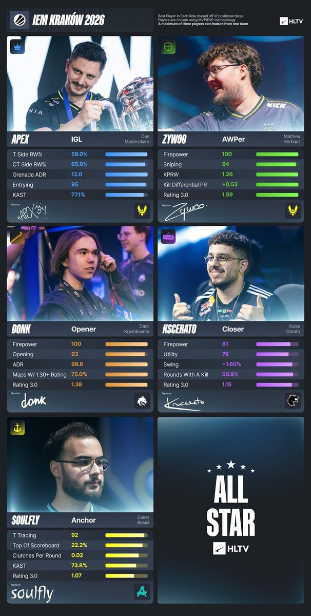 HLTV подвели итоги IEM Krakow 2026 и назвали пятёрку лучших игроков турнира