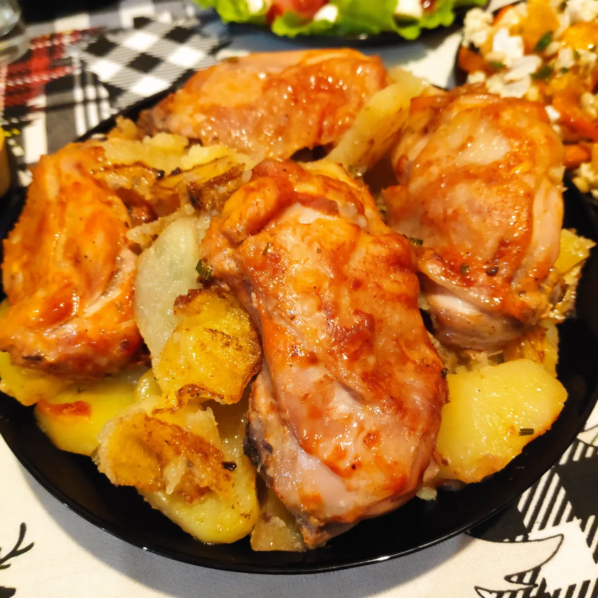 Когда надо приготовить много, и нет времени по отдельности на мясо и гарнир, то выручает такой способ. 1. Куриные бëдра разрезать на 2 части, выложить в глубокую миску и замариновать. 2. Картофель нарезать, выложить в форму для запекания. Добавить соль, специи, растительное масло и перемешать. 3. На картофель выложить куски курицы. Накрыть крышкой/фольгой и готовить в разогретой духовке при 180° 40-45 минут. 4. Снять крышку/фольгу и продолжить готовить до мягкости картофеля. Приятного аппетита!