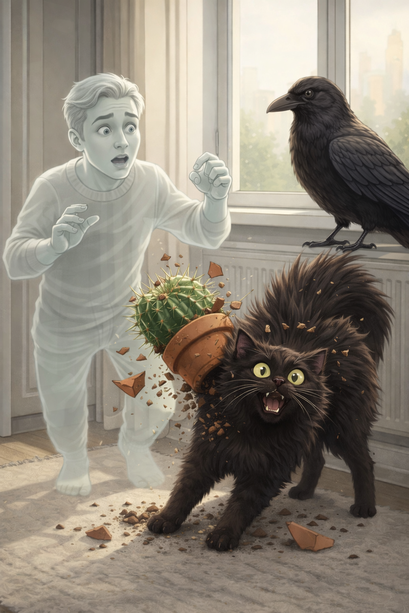 Внезапно я почувствовал знакомую вибрацию в воздухе. Эфирную рябь, которая всегда говорит кричит: «Сейчас что-то пойдёт не так» 😮💨 Это был Прозрачный. Он парил у подоконника с видом сосредоточенного хирурга. Его взгляд был прикован к кактусу. К тому самому, колючему, воинственному суккуленту, который рос там с тех пор, как Арина пыталась «озеленить пространство» 🌵