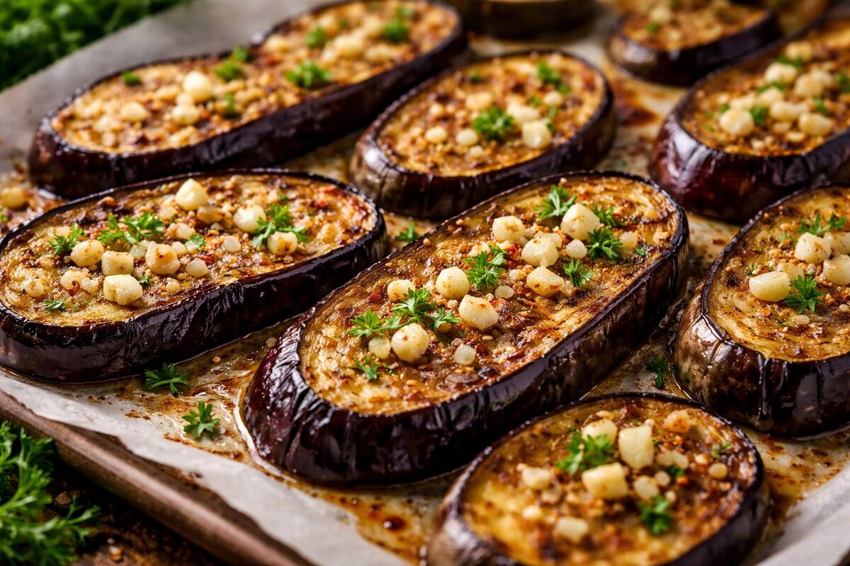 Всем привет! С вами папа Кулинарного беспредела! И сегодня у меня для ас что-то интересное — баклажаны. С баклажанами всегда странная история. Их либо обожают, либо обходят стороной. Кто-то говорит: «горчат», кто-то «резиновые», а кто-то просто уверен, что без литра масла они невкусные. Я тоже долго думал, что баклажан — это сложный овощ. Пока не перестал его жарить. Оказалось, всё меняется, когда его не мучают на сковороде, а дают спокойно запечься. Без суеты, без лишнего масла и без постоянного переворачивания. И тогда баклажан перестаёт быть проблемой, он становится просто вкусным. На самом деле баклажан любит простоту и терпение. Запечённые баклажаны с чесноком — это уже самостоятельное блюдо. Их можно подать как горячую закуску, посыпав зеленью. Можно добавить ложку йогурта или сметаны получится почти восточный акцент. Можно положить их на тост с ломтиком сыра. А можно просто есть так, прямо с противня, потому что они, обычно заканчиваются быстрее, чем планировалось. И самое удив