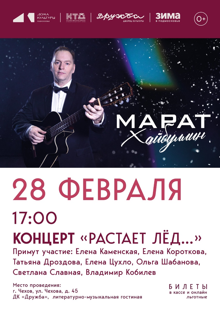 🎸Марат Хайбуллин - гитарист, яркий и талантливый исполнитель песен и романсов. Музыкант ансамбля джазовой музыки "Доктор Чехов" и оркестра "Серебряные трубы". 📆 28.02.2026 🕛 17:00 🏢 ДК «Дружба» 📍 г. Чехов, ул. Чехова, д.45 💰 Цена: 550 ₽ ⭐Поддержать канал голосом ✅ Мероприятия Чехов https://dzen.ru/id/66cc4b48e9ef144699238a51 http://vk.com/chekhov_events http://dzen.ru/chekhov_events