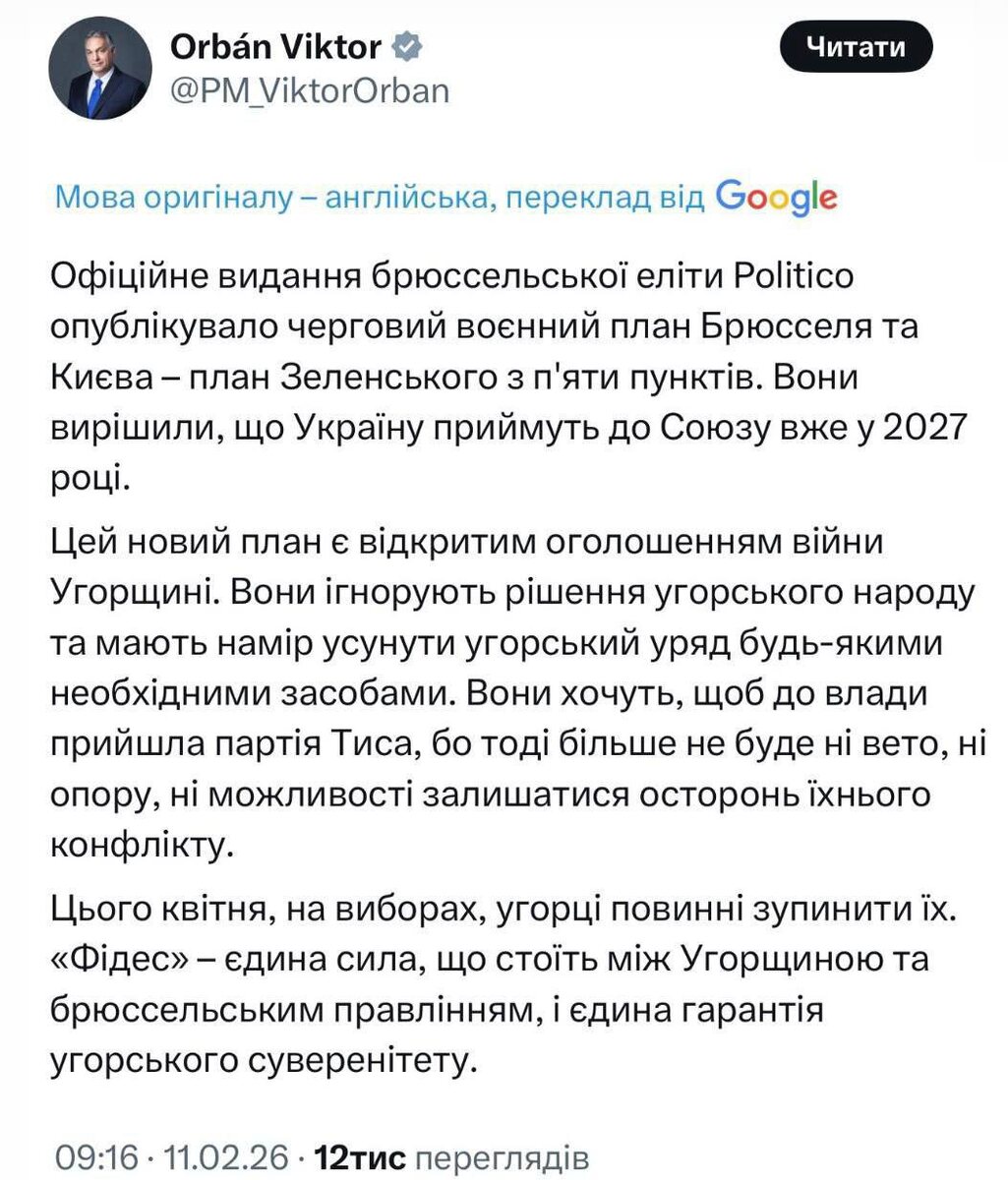 Премьер-министр Венгрии Виктор Орбан назвал инициативу ЕС о частичном принятии Украины в 2027 году в обход венгерского вето «открытым объявлением войны». По его словам, Брюссель игнорирует волю венгерского народа и пытается сменить правительство, чтобы снять препятствия для Украины. Орбан подчеркнул, что сохранить независимость Венгрии можно, если на выборах победит партия «Фидес». Сайт "Другая Украина" / Telegram / Вконтакте / Центр поддержки Украинцев / Жалоба на ТЦК "Другая Украина" теперь в МАХ