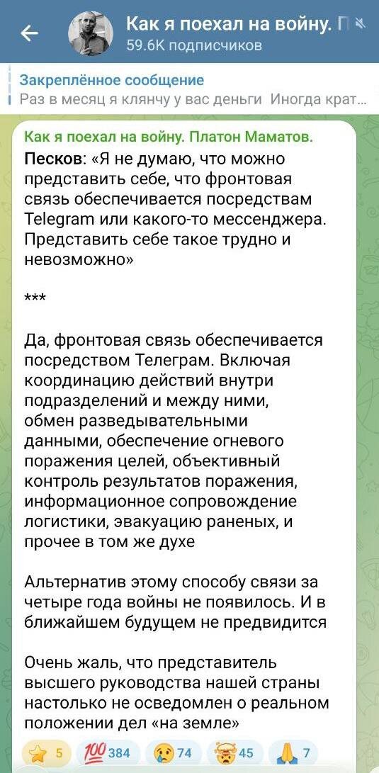 🗣 «Я не думаю, что можно представить себе, что фронтовая связь обеспечивается посредством Telegram или какого-то мессенджера. Представить себе такое трудно и невозможно», — Песков.