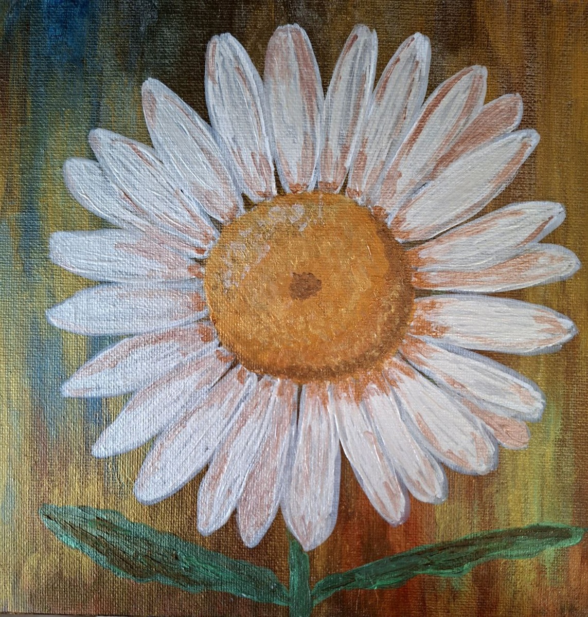 В этой работе цветок снова выходит на передний план, но теперь пространство становится вертикальным и почти условным. Фон построен на полосах — цвет течёт сверху вниз. Это не трава и не плоскость. Это поток. Ромашка расположена строго по центру. Симметрия подчёркнута, но не выверена академически — лепестки всё равно разные, слегка смещённые, живые. Здесь нет стремления к декоративной идеальности. Есть удержание формы внутри движения. Сердцевина стала более плоской по цвету. Она менее фактурная, чем в предыдущих работах, но за счёт тёплого жёлтого звучит устойчиво. В ней нет драматизма — она спокойная, почти ровная. Это уже не акцент, а ось. Лепестки приобрели лёгкий розоватый оттенок. Белый перестал быть чистым — в нём появилось тепло. И именно это делает работу мягче, несмотря на активный фон. Стебель и листья остаются условными. Они не конкурируют, не усложняют композицию. Их задача — поддерживать вертикаль и не разрушать центр. Если сравнивать с предыдущими работами цикла: