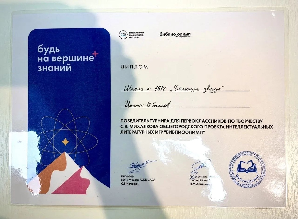 Спешим поздравить наших ребят из 1-Д класса, которые принимали участие в турнире для первоклассников по творчеству Сергея Владимировича Михалкова общегородского проекта интеллектуальных литературных игр "Библио Олимп". Подробности в МАХ #Школа1518 #ДОНМ #ГородскойПроект #ШколыКолледжиМосквы