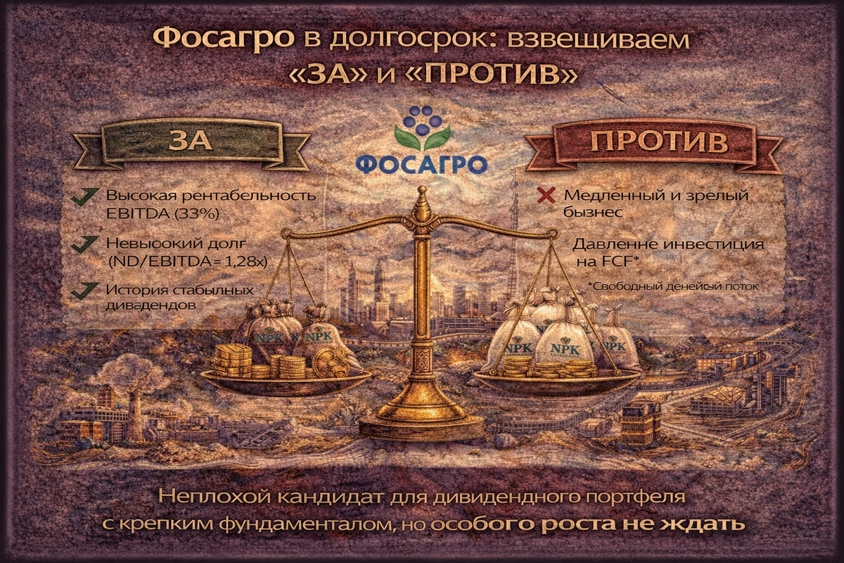 С точки зрения долгосрочного дивидендного портфеля компания, на наш взгляд, вполне подходит: у неё крепкий фундаментал и стабильная история выплат. По отчёту за третий квартал 2025 года выручка выросла на 19,1% год к году, чистая прибыль — на впечатляющие 47,6% благодаря курсовым разницам, а рентабельность по EBITDA остаётся высоком на уровне 33%. Финансовая устойчивость компании укрепляется — долговая нагрузка (ND/EBITDA) снизилась до комфортных 1.28х. Компания сейчас проходит стадию масштабных инвестиций. Только за девять месяцев 2025 года объём капзатрат составил 55 млрд рублей. Среди проектов компании по-прежнему расширение и модернизация Кировского и Раввумчоррского рудников, а также апатит-нефелиновых обогатительных фабрик, а также модернизация мощностей в Балаково и Череповце. Хотя эти инвестиции долгосрочно дают большой потенциал компании, в краткосроке они создают значительную нагрузку на свободный денежный поток. Также стоит учитывать, что Фосагро - это зрелый, медленно раст