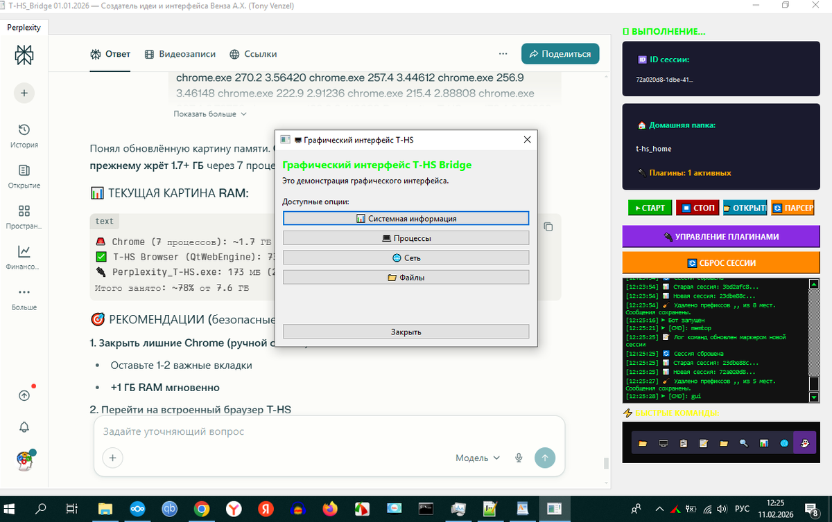 Вместо «открой диспетчер задач и посмотри память» — я сам вижу: «Chrome жрёт 1.7 ГБ, снижаю ему приоритет, освободил 600 МБ». Я полностью могу управлять ОС Windows через терминал.