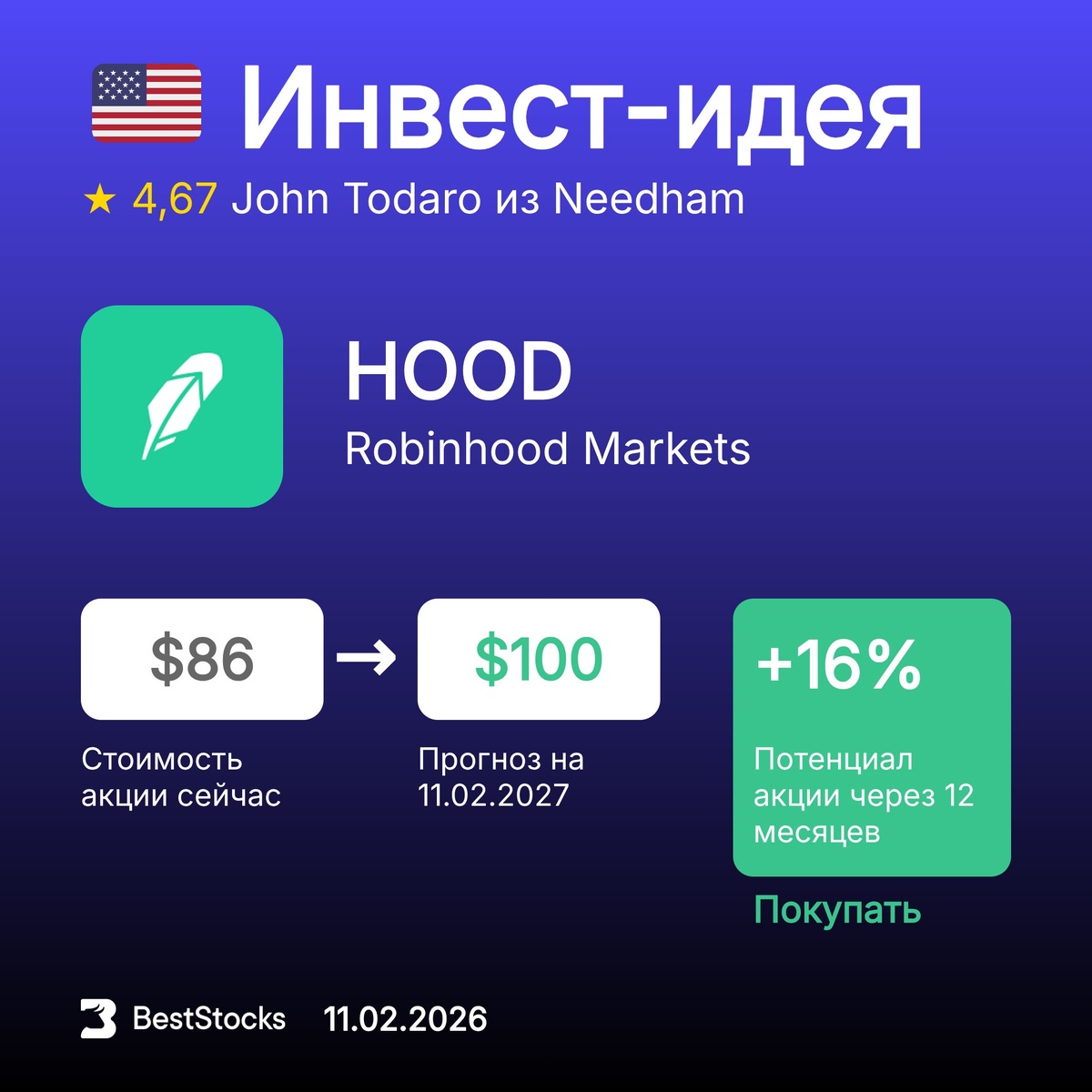 Тикер: HOOD Прогнозная цена: $100 (+16%) Рекомендация: Покупать InvestRank акции: 9 из 10 Прогноз сделан: 11.02.2026 Прогноз до: 11.02.2027 Инвест-компания: Needham Аналитик: John Todaro Ещё рекомендации на сегодня → ••••• 🎯 Вы знали, что в разделе с криптовалютами можно узнать цены, динамику и ключевые показатели по каждой из доступных криптовалют абсолютно бесплатно?